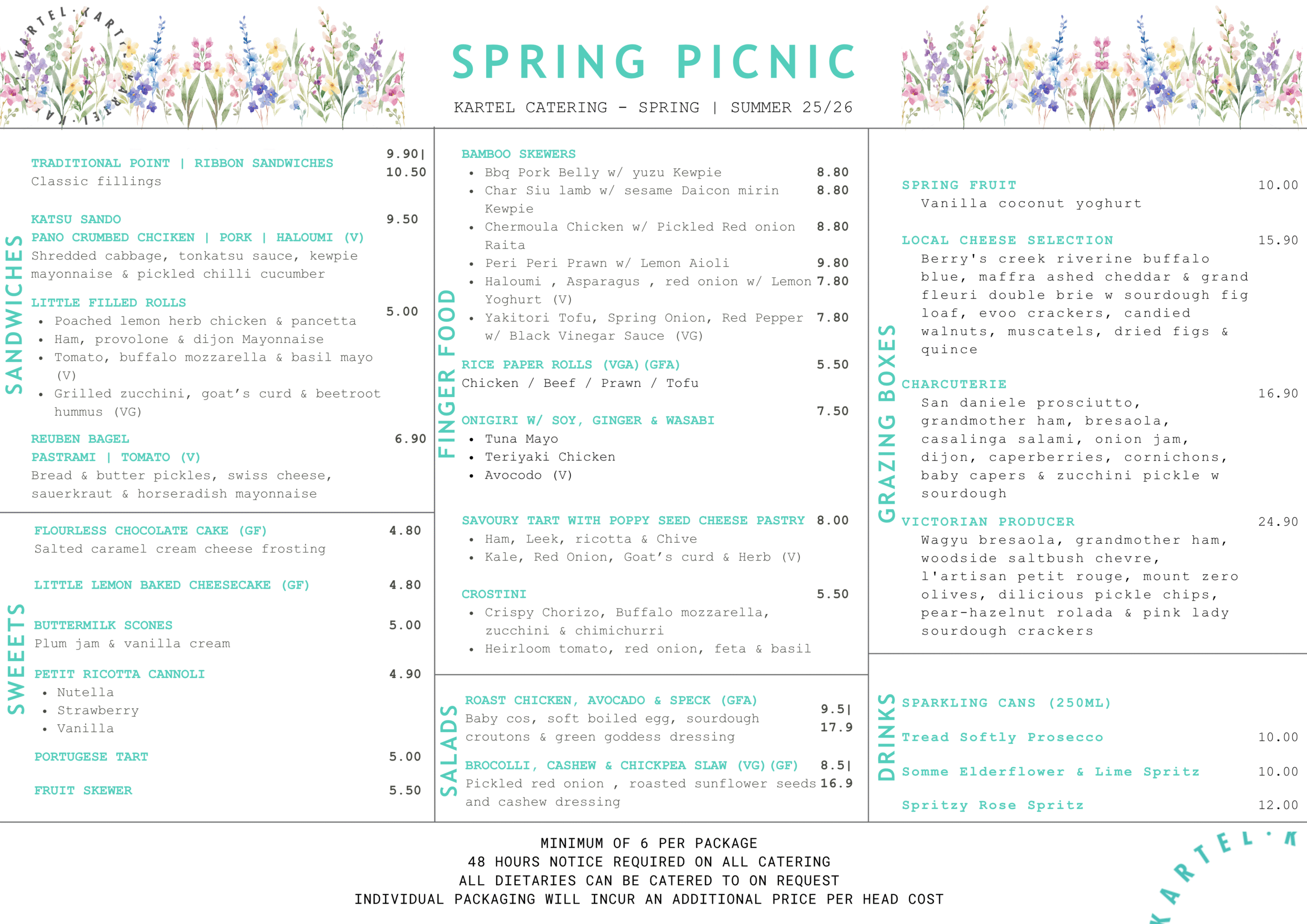 EMAIL CATERING@KARTEL.NET.AU FOR LAST MINUTE ORDERS